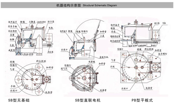 SB/PB型離心機是一種密閉作業、間歇操作、人工上部卸料的過濾式離心機。全開大翻蓋,卸料更方便。大翻蓋采用獨特快開扳手,啟蓋有手動、氣動、液壓、電動等驅動方式。