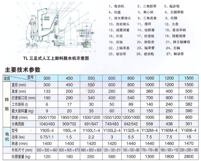 TL型三足式工業(yè)脫水機(jī)為人工上部卸料、間歇操作的過(guò)濾脫水機(jī)。